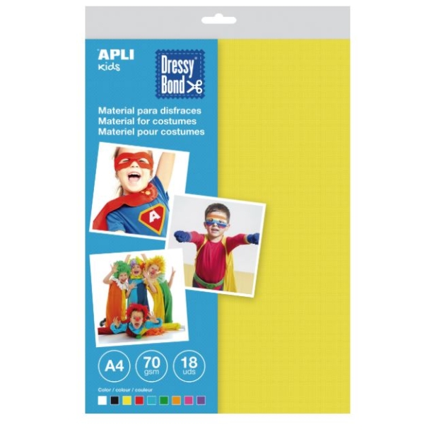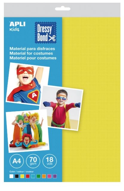Pack de 18 hojas de Dressy Bond tamaño A4 en colores surtidos: blanco, negro, amarillo, rojo, azul, verde, naranja, rosa y lila. Cada pack contiene 18 hojas (2 por color) de 70 g/m². Dressy Bond es un material con textura efecto tela, suave, transpirable, resistente, repelente al agua, seguro, lavable, que no se deshilacha y reciclable. Ideal para crear disfraces y complementos. Se puede pintar con témpera, pintura acrílica, rotulador, bolígrafo, esmalte... así como pegar con cola blanca, de contacto, cinta doble cara, silicona e incluso grapar y coser.