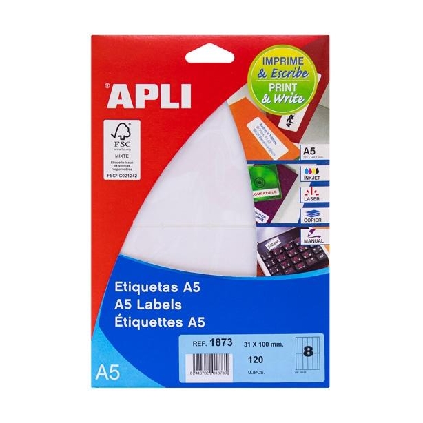 APLI ETIQUETAS ADHESIVAS 31X100MM MANUAL/IMPRESIÓN C/ROMOS 8 X 15H A5 BLANCO