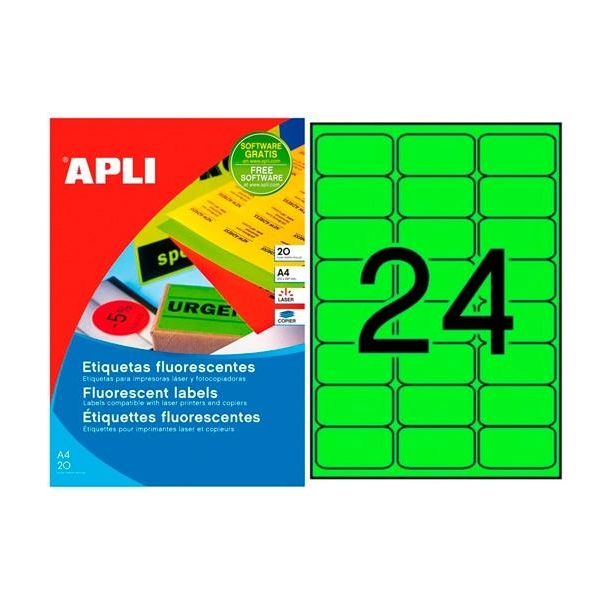 APLI ETIQUETAS ADHESIVAS 64,X33,9MM LÁSER C/ROMOS 24 X 20H VERDE FLUORESCENTE