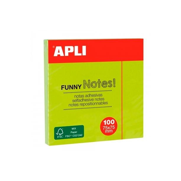 APLI NOTAS ADHESIVAS FUNNY 75X75MM BLOC 100H VERDE FLUORESCENTE -12U-