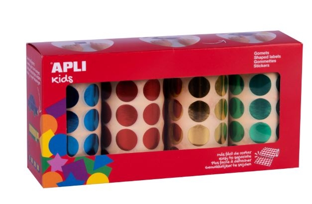 Pack en colores parchís: rojo, azul, amarillo y verde con adhesivo permanente. El pack contiene 4 rollos (uno por color). Cada rollo contiene 59 hojas pretroqueladas para una fácil separación, 35 gomets por hoja y un total de 2.065 gomets por rollo, haciendo un total de 8.260 gomets por pack.