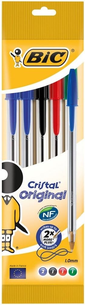 Este blíster contiene 2 unidades azules, 1 roja, 1 en verde y 1 en negro del BIC Cristal Original, el bolígrafo más vendido del mundo