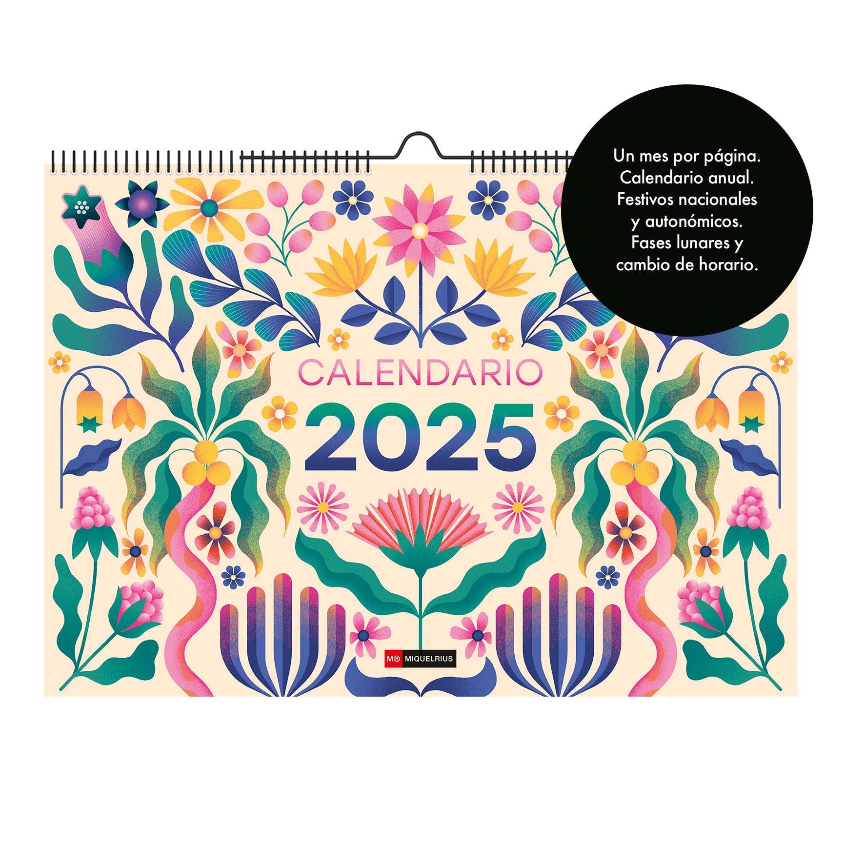 Anualidad: 12 meses (Enero-Diciembre 2025) con espacio para anotar. Tamaño: A3 (420 x 296 mm) Papel: 150 g/m². FSC Mix Credit. Idioma: Castellano. Calendario con diseño exclusivo creado por un ilustrador con una imagen diferente en cada mes. Contenido: Calendario anual. Festivos nacionales y de comunidades autónomas. Fases lunaresy cambio de horario. Carátula explicativa. Encuadernación: Espiral doble, con pieza para colgar