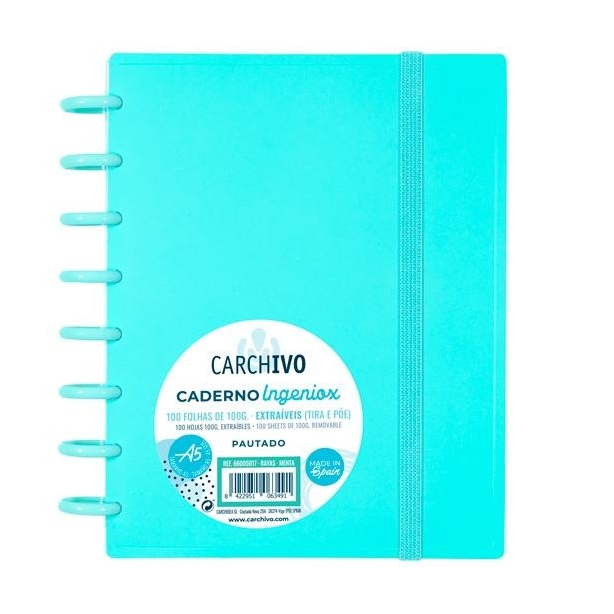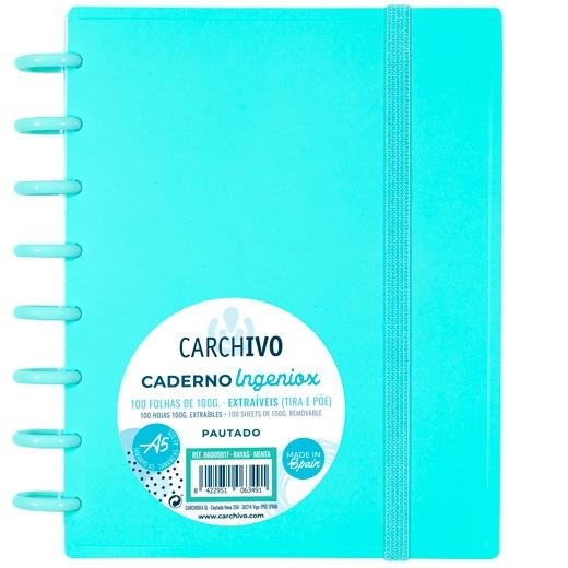 CARCHIVO CUADERNO INGENIOX ESPIRAL A5 100H C/SEPARADORES EXTRAÍBLES CUADRÍCULA 5X5 TAPAS PP SEMI-RÍGIDO CIERRE C/GOMA MENTA PASTEL