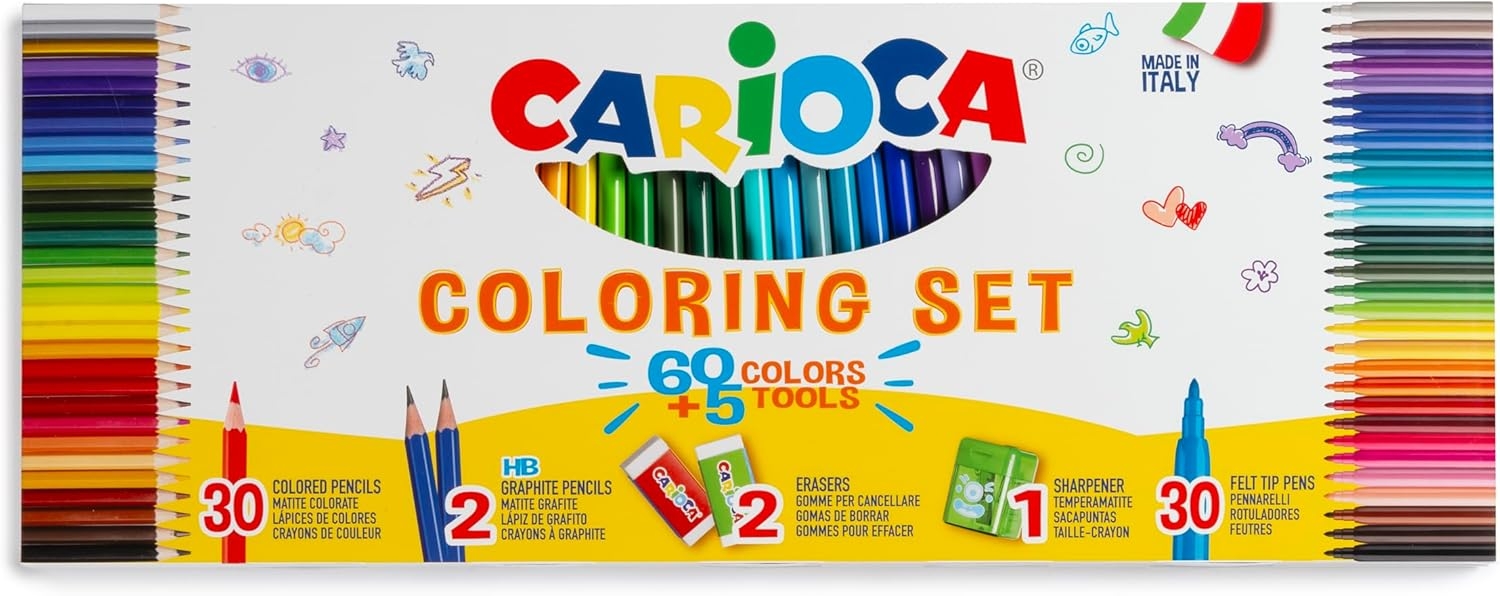 CARIOCA SET COLORING 65 PIEZAS (30 ROTULADORES, 30 LAPICES DE COLORES, 2 LAPICES HB, 2 GOMAS DE BORRAR Y 1 AFILALAPIZ)