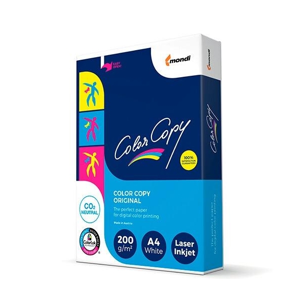 Color Copy, Original, blanco, satinado, papel reprográfico, Pasta química ECF, 200g/m2, 210mm x 297mm, A4, Fibra al lado largo, 250 hojas/paq, FSC Mix Credit. Papel blanco para impresión en color. Pigmentado y satinado para ofrecer una lisura excepcional y una blancura reluciente que sorprende por su tono ligeramente azulado y su suavidad. Impresiones nítidas y claras, colores brillantes y excelentes propiedades físicas. Papel profesional para las máquinas de impresión digital que le garantiza unos resultados a la altura de todas sus expectativas. Ventajas del producto: Excelente para impresiones a todo color. Superficie extra suave. Suave transferencia de tóner. Certificación ColorLok® para obtener colores más brillantes en inkjet. Certificación FSC® para una mayor protección del medio ambiente. Certificado Ecolabel. Carbón Neutro". Cradle-to-Cradle Certified® bronce producto seguro, circular y fabricado de forma responsable. Aplicaciones: Comunicaciones externas, mailings, manuales, informes, posters, folletos, catálogos, tarjetas de visita… Ficha Técnica: Impresión laser e inkjet a color. Impresión en tóner seco". Garantías: ISO 9001. ISO 9706. OHSAS 18001". Recomendaciones medioambientales: Certificado FSC/FSC-C015522, ISO9001, ISO14001, ECF, Eco-etiqueta Europea, Carbón Neutro.