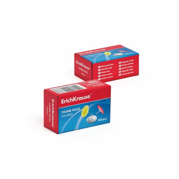 Chinchetas metálicas de colores ErichKrause® (caja 100 uds). Chinchetas de colores de alambre de acero de alta calidad con caracteristicas de resistencia mejoradas. Adecuado para uso multiple. Resistente a la corrosion. Papel sin manchas.