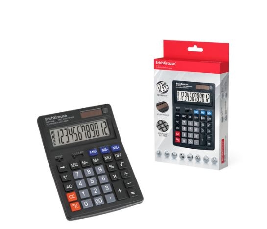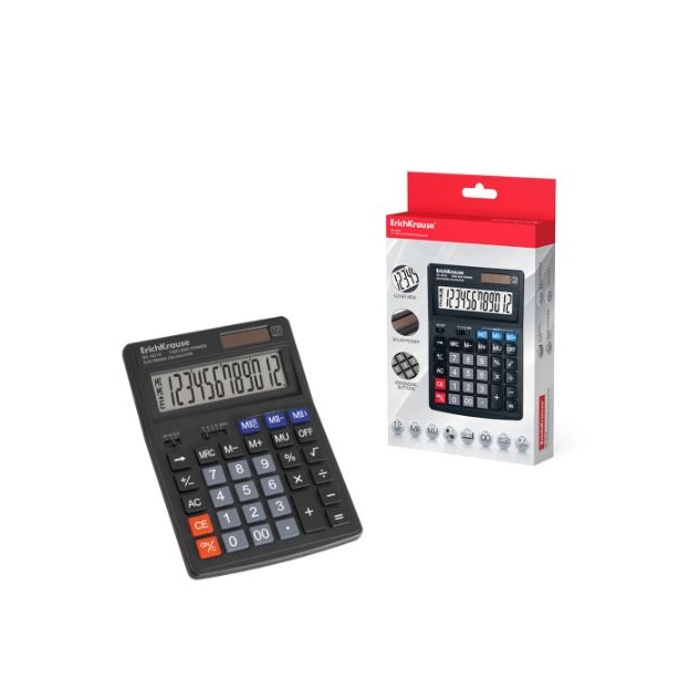 Calculadora electronica en estuche de plastico con pantalla LCD de 12 digitos con cubierta acrilica. Tiene una memoria doble. El conjunto optimo de funciones de calculo permite realizar operaciones matematicas basicas, calcular porcentajes, extraer la raiz cuadrada, resumir las operaciones realizadas y memorizar el resultado intermedio. El teclado conveniente esta equipado con botones de "00" cero y tecla de retroceso. Tiene selector de redondeo y selector de punto decimal. El elemento de energia solar se puede cargar tanto con la luz solar directa como con las luces de techo de la oficina, lo que ayuda a ahorrar una carga de una bateria alcalina.