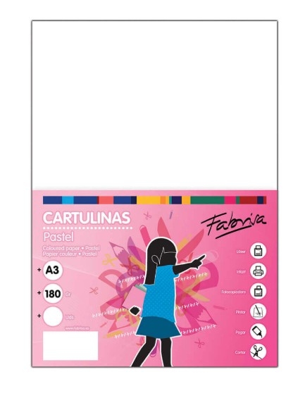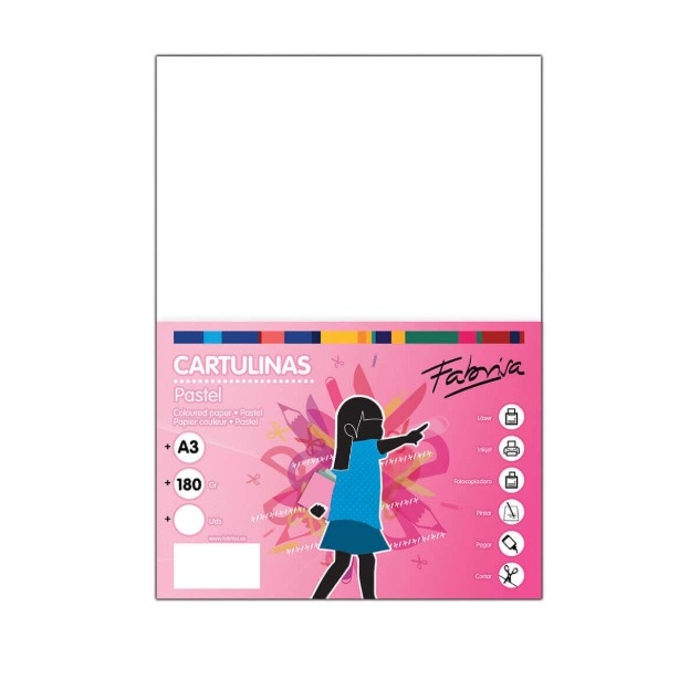 Cartulina blanca de 180 g/m² tamaño A3. Cada pack contiene 50 cartulinas, tintadas en masa, ofreciendo así unos colores más homogéneos y nítidos. Ideal para su uso escolar, todo tipo de manualidades, cubiertas, separadores, impresión de documento, etc.