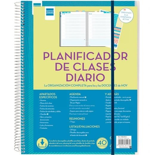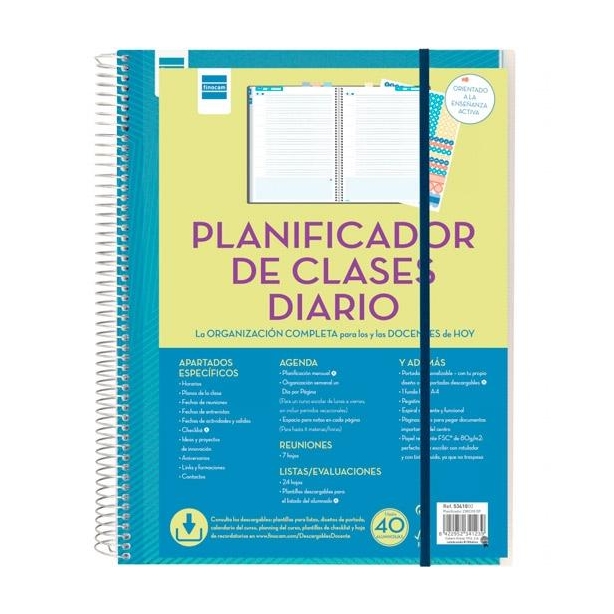 Planificador de clases 1 Día Página para organizar hasta 8 horas/materias y con espacio para anotaciones. Con esquinas microperforadas para localizar rápidamente el día/semana en curso. Concebido para adaptarse a cualquier especialidad del mundo educativo: profesores, maestros, coaches, tutores, educadores, etc. Dispone de apartados específicos para los docentes. Diseño actual y moderno tanto de la cubierta como de su interior. Con espiral simple metálica resistente, goma elástica y tapas de polipropileno que permiten la personalización de la portada.