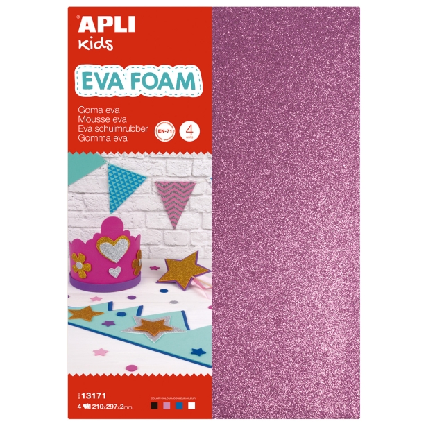 Pack de goma EVA purpurina tamaño A4 (210 x 297 mm) y grosor 2 mm en colores surtidos: blanco, negro, rosa y azul. Cada pack contiene 4 hojas (1 por color). La goma EVA es un material idóneo para manualidades tanto para uso doméstico como para uso escolar. Es suave, flexible, fácil de cortar, pegar y pintar. También es impermeable y moldeable al calor. El material básico para hacer fofuchas, máscaras, coronas, disfraces y todo tipo de manualidades