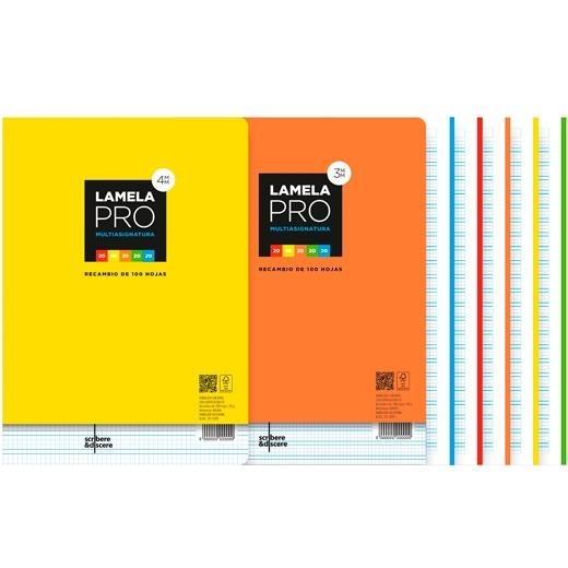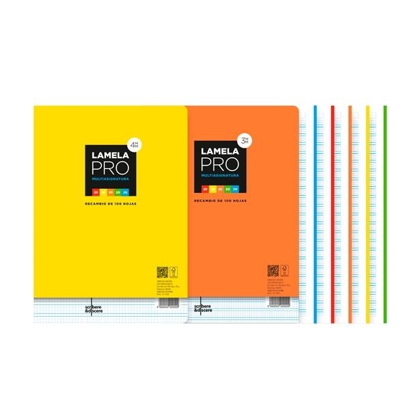 LAMELA RECAMBIO PRO 4 TALADROS 100H A4 90GR CUADROVÍA 3MM MULTIASIGNATURAS 5 COLORES