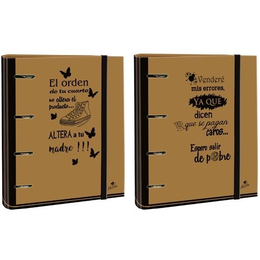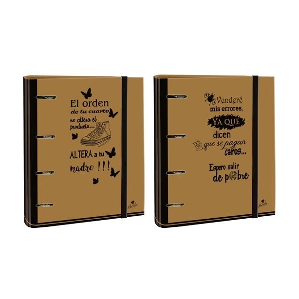 MARIOLA CARPEBLOCK 4 ANILLAS MIXTAS 40MM FOLIO C/GOMA CARTÓN FORRADO ORO PLASTIFICADO 6 FRASES DISEÑOS SURTIDOS