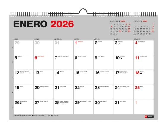 Calendario de pared. Anualidad: 12 meses (Enero-Diciembre 2026) con espacio para anotar. Papel: 120g/m2. FSC Mix Credit. Idioma: Castellano. Tamaño: Pared: A4 (296 x 210 mm). Contenido: Calendario anual en el dorso de cada mes. Festivos nacionales, de comunidades autónomas y de capitales de provincia. Calendario 2027. Onomástica y fases lunares. Carátula explicativa.