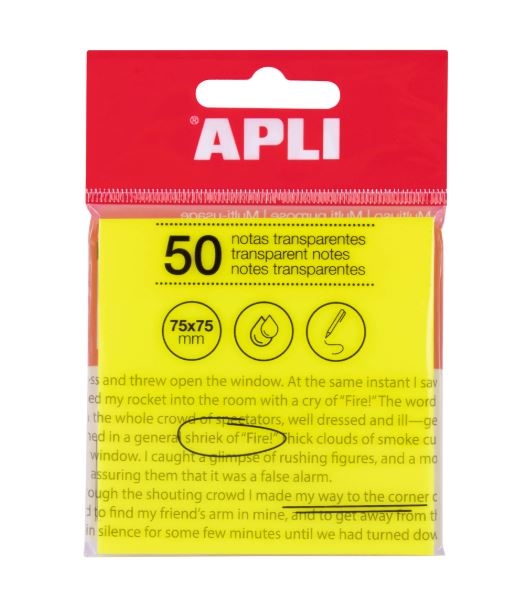 Bloc de 50 hojas de notas adhesivas transparentes de 75 x 75 mm en color amarillo fluorescente. Son ideales para hacer anotaciones rápidas, resaltar información importante en documentos, sin perder la visibilidad del texto o la imagen original, o para estudiar sin necesidad de marcar los libros en caso de ser prestados. Resistentes al agua, se recomienda el uso de bolígrafos o lápices con tinta a base de aceite para un secado más rápido y evitar borrados accidentales.