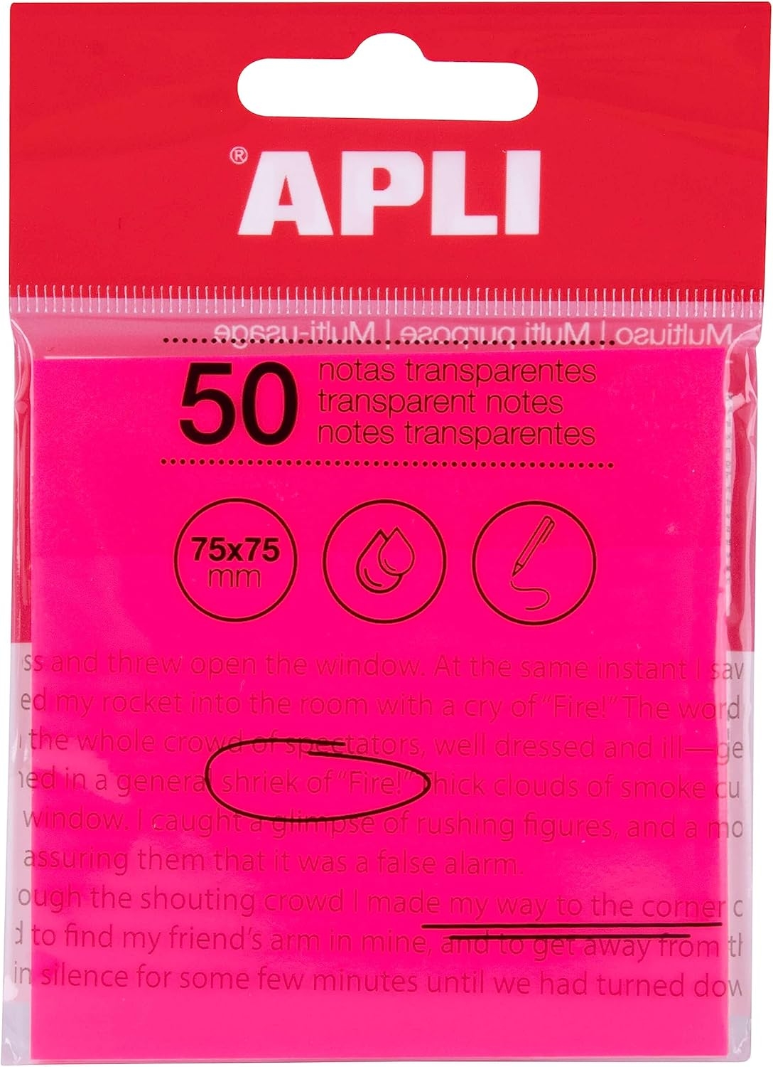 Bloc de 50 hojas de notas adhesivas transparentes de 75 x 75 mm en color rosa fluorescente. Son ideales para hacer anotaciones rápidas, resaltar información importante en documentos, sin perder la visibilidad del texto o la imagen original, o para estudiar sin necesidad de marcar los libros en caso de ser prestados. Resistentes al agua, se recomienda el uso de bolígrafos o lápices con tinta a base de aceite para un secado más rápido y evitar borrados accidentales.