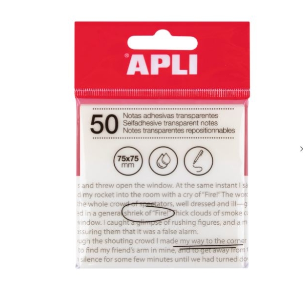 Bloc de 50 hojas de notas adhesivas transparentes de 75 x 75 mm en color blanco. Son ideales para hacer anotaciones rápidas, resaltar información importante en documentos, sin perder la visibilidad del texto o la imagen original, o para estudiar sin necesidad de marcar los libros en caso de ser prestados. Resistentes al agua, se recomienda el uso de bolígrafos o lápices con tinta a base de aceite para un secado más rápido y evitar borrados accidentales.