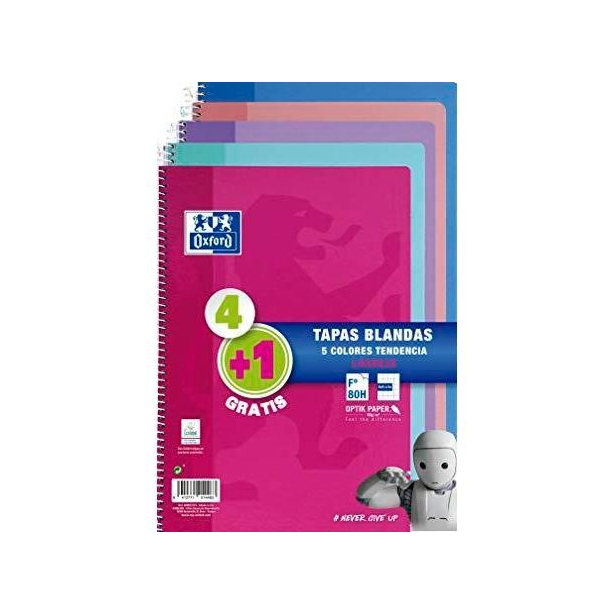 OXFORD CUADERNO ESPIRAL 80 HOJAS 4X4 CON MARGEN TAPAS BLANDAS FOLIO COLORES TENDENCIA -PACK 4+1-