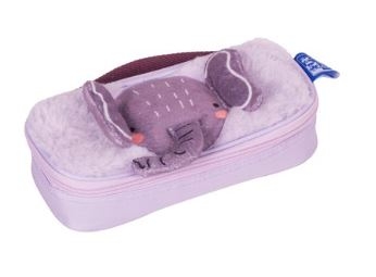 Estuche infantil con asa para transporte; solapa suave de peluche; base de poliéster; tirador con forma de animal; forro interior a juego.