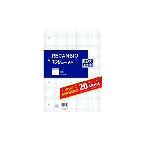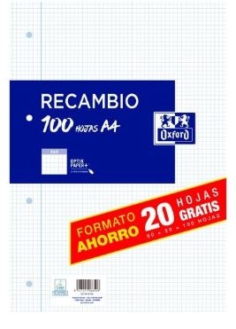 RECAMBIO OXFORD SCHOOL A4 100h (80+20) 90gr 4 TALADROS CUADRIC.4x4 C/MARGEN AZUL