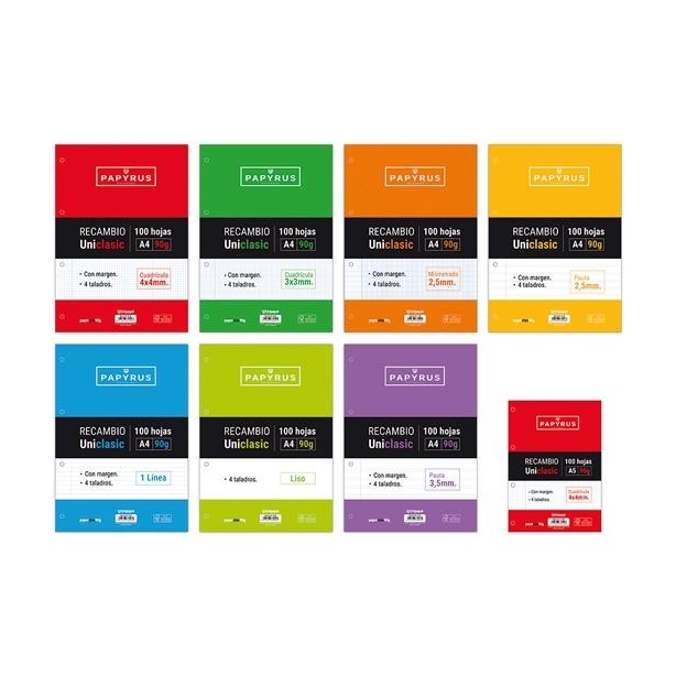 PAPYRUS RECAMBIO UNICLASIC 4 TALADROS A4 90GR 100H CUADRÍCULA 4MM AZUL C/M EXTRABLANCO
