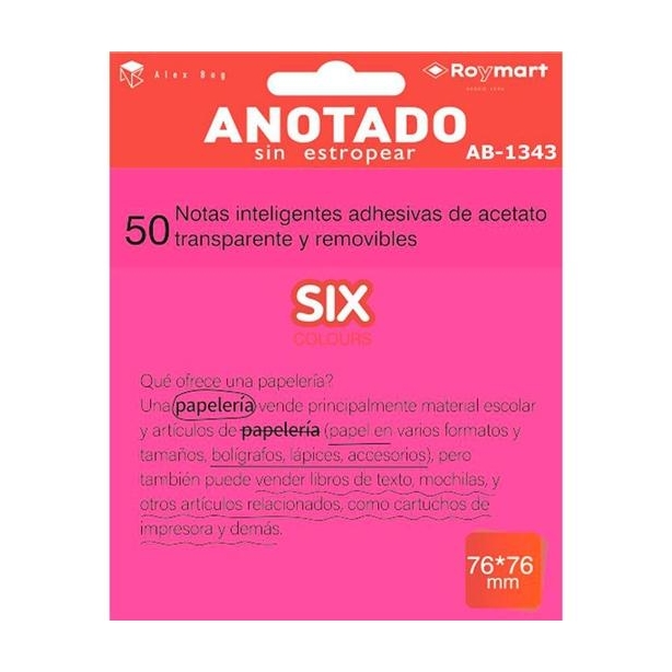ROYMART BLOC NOTAS ADHESIVAS INTELIGENTES REMOVIBLES TRANSPARENTES 50H 76X76MM ACETATO ROSA FLÚOR