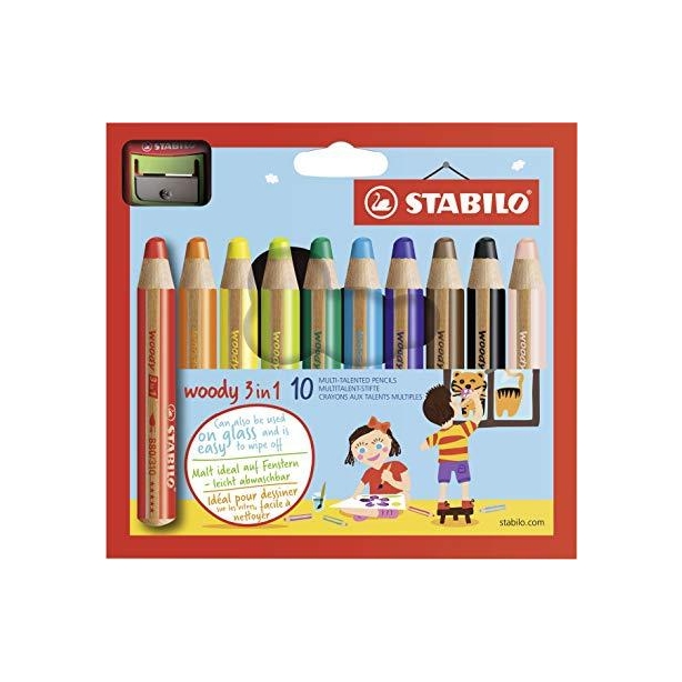 Estuche con 10 lápices de color multitalento STABILO woody 3 en 1 + sacapuntas. Lápiz de color, cera y acuarela, todo en uno. Fabricado con madera certificada 100% PEFC. Mina XXL. Ideal para grandes áreas y para casi cada técnica de pintura. Gracias a su grueso cuerpo es ideal para las manos de los niños. Mina anti-rotura, diámetro 10 mm. Trazos gruesos y suaves. Colores intensos, incluso en papel oscuro. También escribe sobre superficies como el crital, metal, etc...