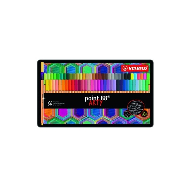 Estuche de metal con 66 rotuladores Stabilo 88: uno por color y dos negros. Ideal para amateurs, profesionales.