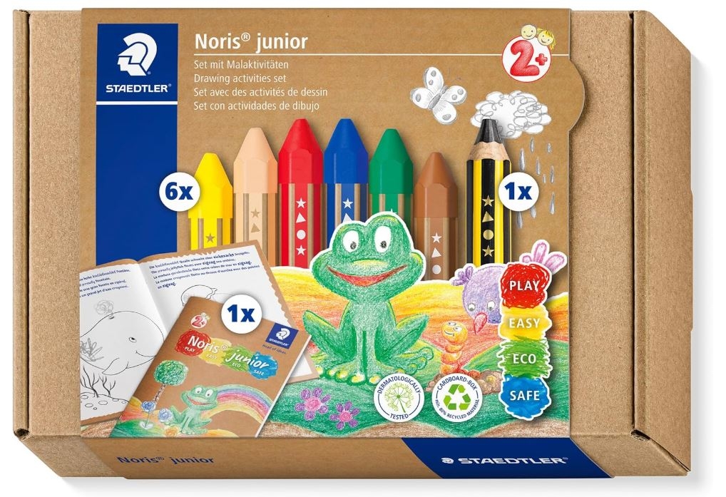 El tamaño extra grueso tanto del lápiz Noris junior 121 como de las ceras Noris junior 224 es ideal para las manos de los niños, haciendo del coloreado una actividad aún más divertida. Dermatológicamente testado.